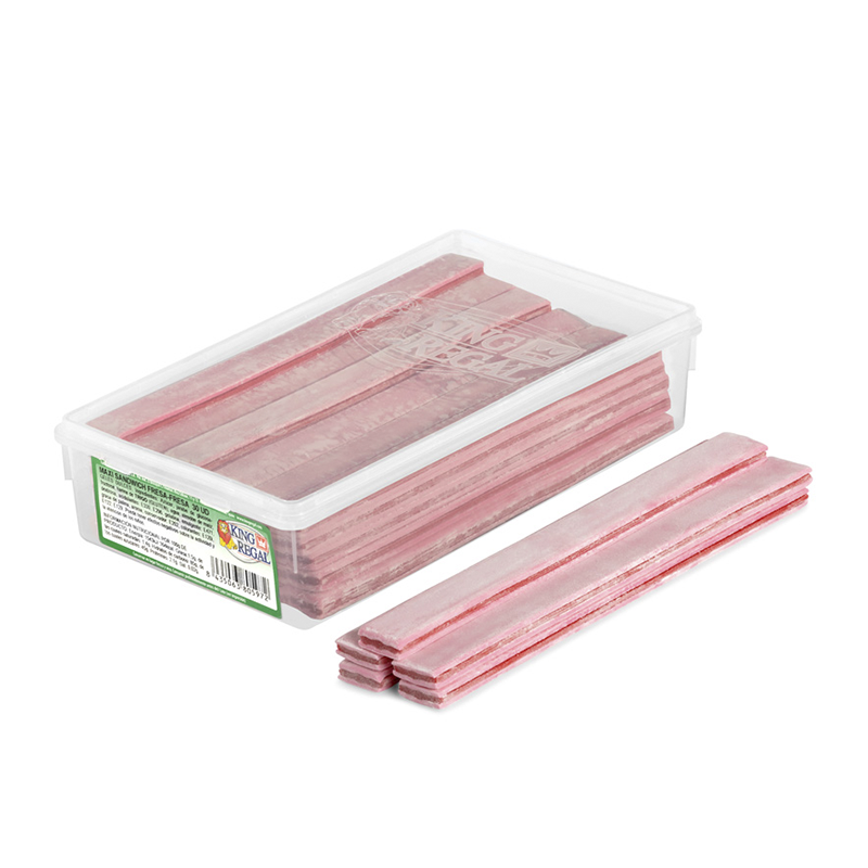 Pieza lisa y plana, rellena en su interior de una lámina de regaliz semejando un sándwich y con un tratamiento superficial de polvo de azúcar.