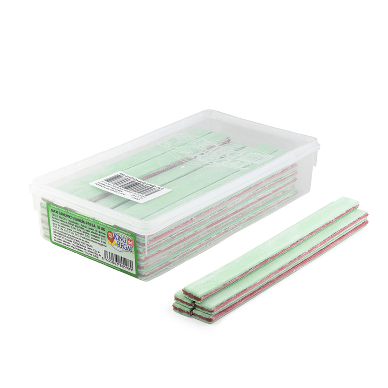 Pieza lisa y plana, rellena en su interior de una lámina de regaliz semejando un sándwich y con un tratamiento superficial de polvo de azúcar.
